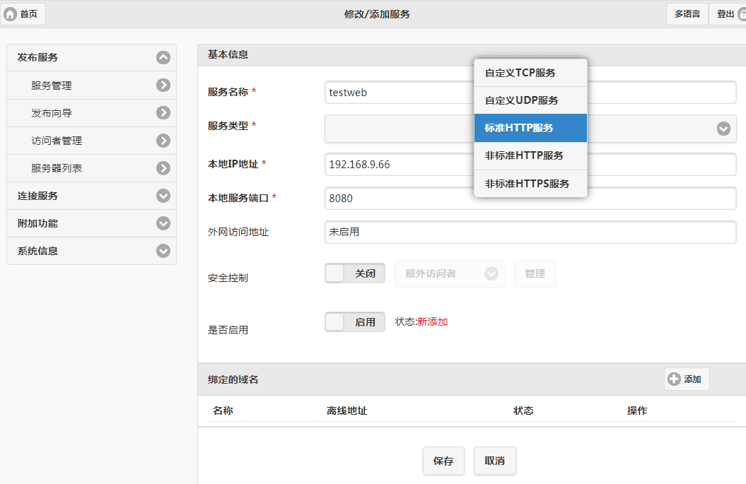 只不过选择HTTP(S)服务可以通过域名直接访问不需要加端口号。