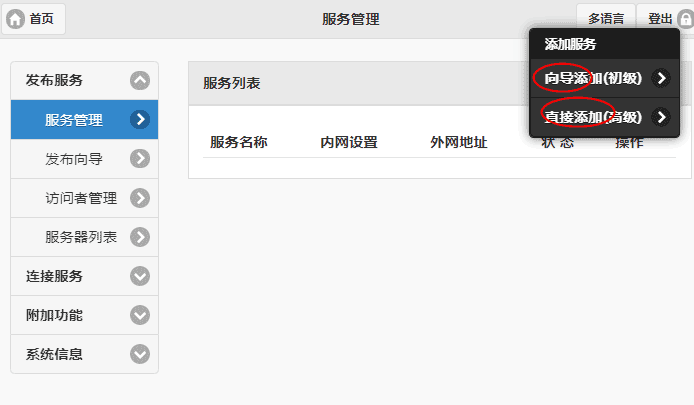 1.1 点击“向导添加(初级)",可快速发布内网服务,如下图所示: