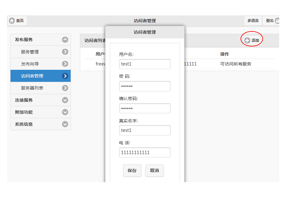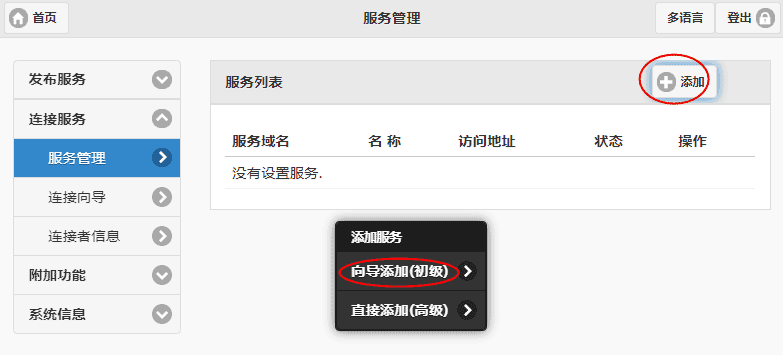 登录进系统,点击”发布服务“-->"服务管理",然后点击“添加”,如下图所示: