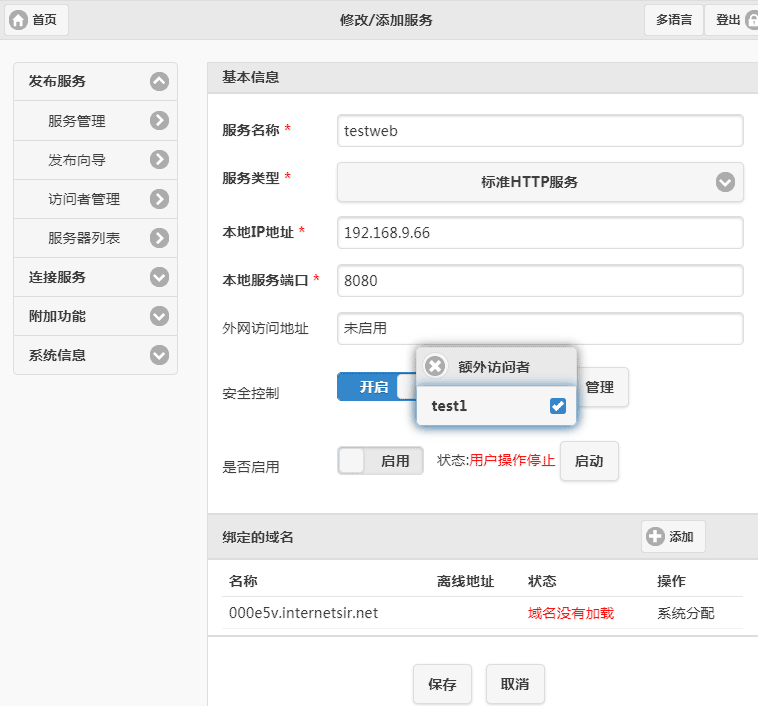 就会自动的绑定到您自己的域名上了。保存完后,再此启动对应的服务就可以用您自己的域名