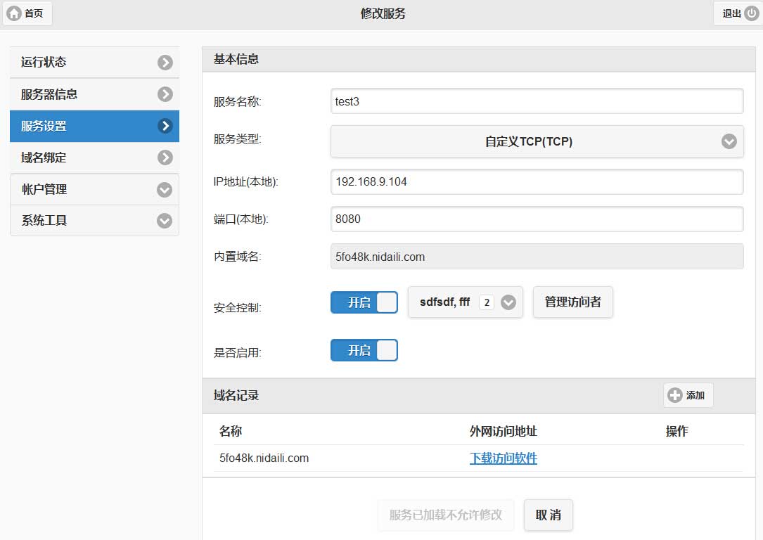 当你的服务只对固定人开放时,就可以考虑采用打开安全访问配置。 登录后,修改一个服务,把”安全控制“开启,选择”管理访问者“,可以添加访问用户,如下图所示: