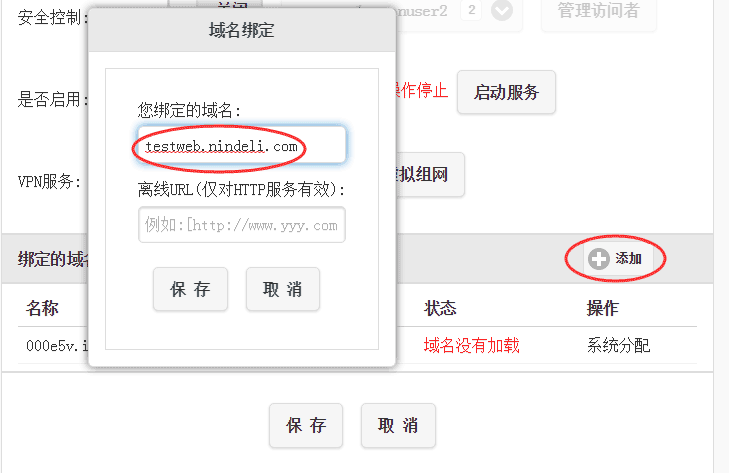 “添加”,输入自己的域名(必须是自己的注册的域名),以及离线URL(可不填写),填写完毕后点击“保存”,如下图所示: