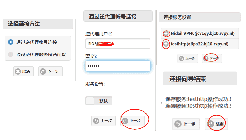 然后根据向导,输入对方的逆代理账号和密码或者对方的服务信息,一步一步就可以代理对方的服务了。